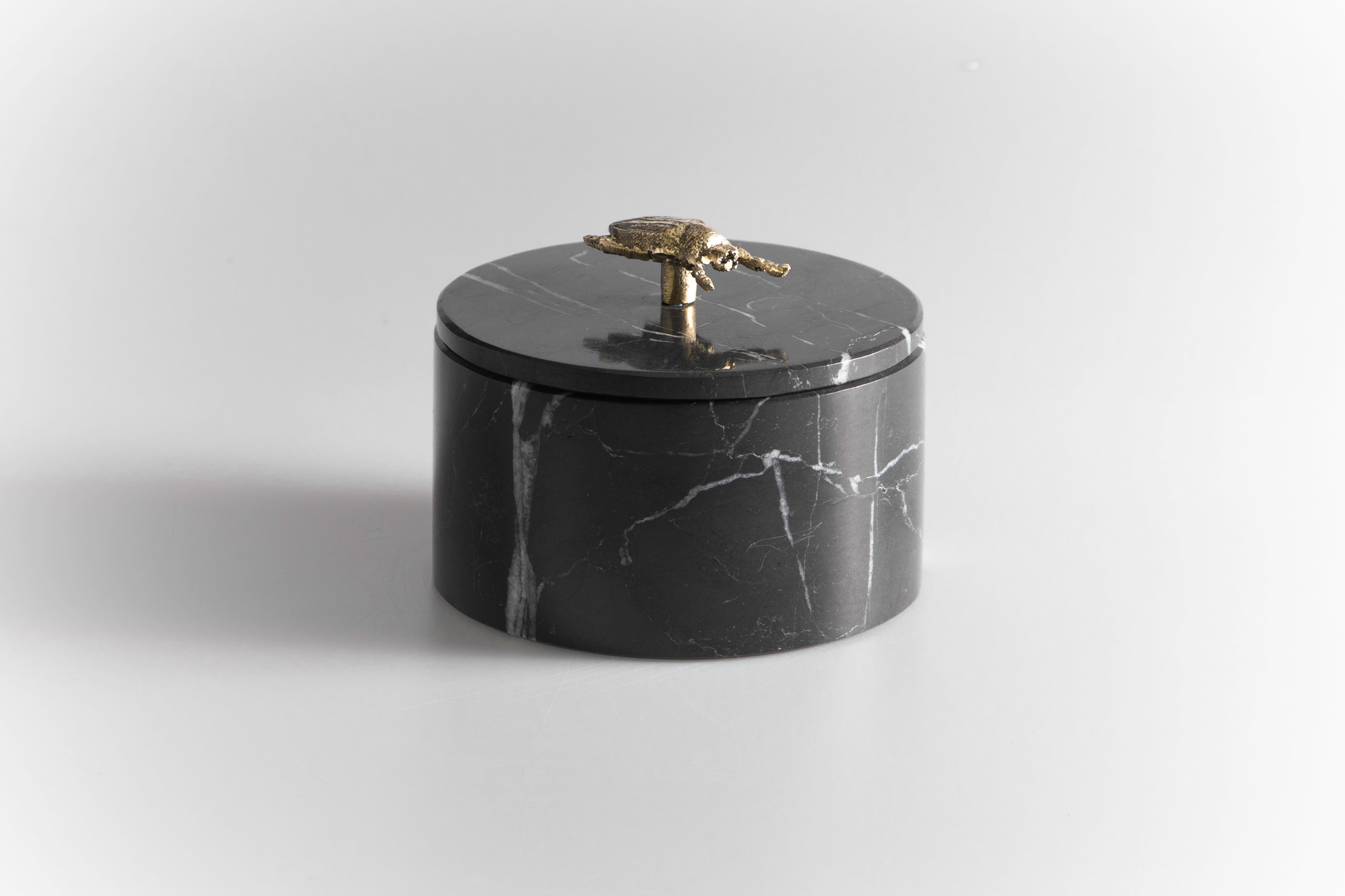Caja de mármol negro con aplicación de escarabajo en bronce, una pieza única, hechas a mano son el accesorio ideal para tu espacio, puedes guardar desde anillos joyas, productos de baño, etc. Evita usar productos abrasivos, asi como ácidos. Limpiar con un paño húmedo.El producto es un material natural y el color puede variar ligeramente de las imágenes mostradas.
