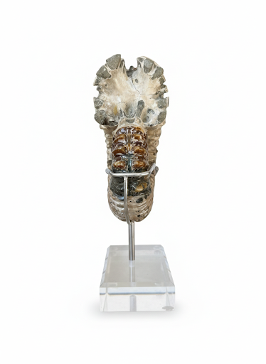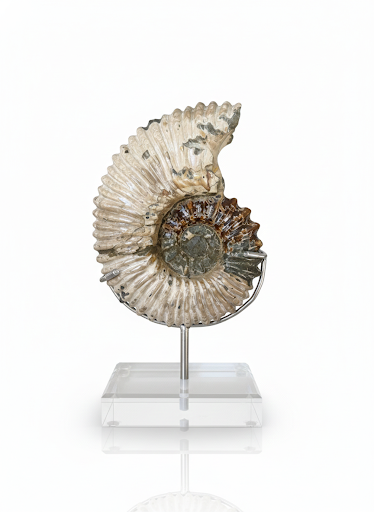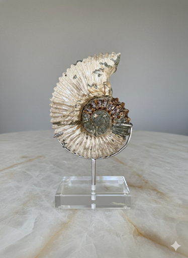 Desert Moss Ammonite features a beautiful blend of sandy beige tones with natural green mineral highlights, giving it a warm, earthy appearance reminiscent of desert landscapes. Carved from genuine fossil ammonite from Madagascar, each piece showcases its own unique spiral pattern, textured ridges, and natural mineral variations. These tones of soft sand and subtle moss create a striking, organic contrast that makes every specimen one-of-a-kind.