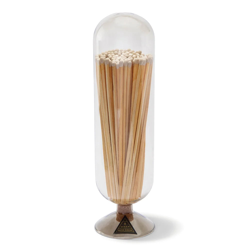 We discovered this vessel shape in Japan and while we weren’t certain what it was for, we knew it was perfect for us. The original was tiny and clear so we made it large enough to hold our best-selling 8" matches and updated it in this sophisticated color palette. Each piece is hand blown and fitted with a cork stopper in the bottom. It reminds us of a vintage glass cloche, originally used to protect emerging seedlings in gardens. Once the matches are gone, it can be a curiosity used to display a found specimen.