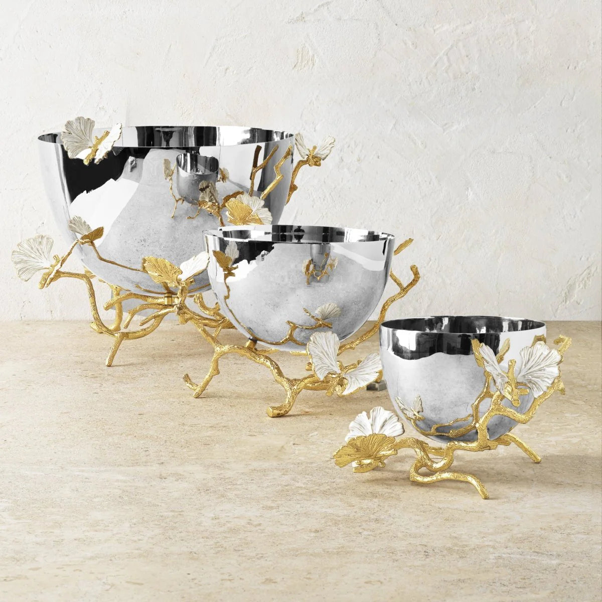 Handcrafted with exquisite attention to detail, the Butterfly Ginkgo Gold Bowl is a striking expression of luxury and artistry. Inspired by the graceful transformation of ginkgo leaves into fluttering butterflies, each bowl features sculpted natural brass branches, hand-polished to a rich gold tone, with delicate white enamel accents that lend an ethereal elegance. The stainless steel vessel reflects the golden forms with a mirror-like finish, enhancing their vibrancy and creating a sense of movement and wonder. Perfect for refined entertaining or as a decorative centerpiece, this piece embodies Michael Aram’s signature craftsmanship and poetic design sensibility.
