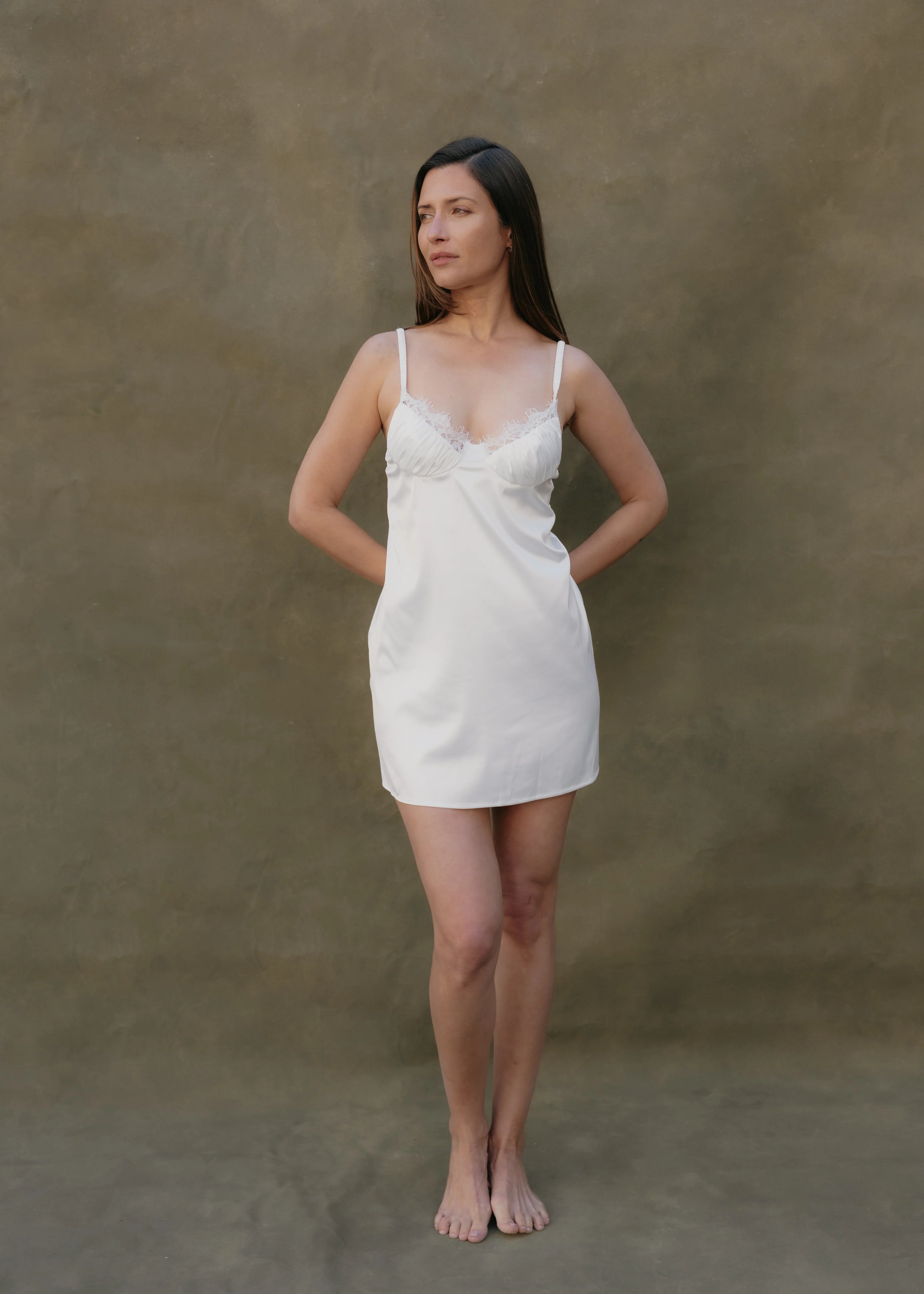El Camisón Brigitte en color blanco es un camisón corto confeccionado en satín elástico, diseñado para brindar un ajuste cómodo y femenino. Incorpora copas con varilla elaboradas en satín, con un delicado borde de encaje que realza y define el busto de forma natural. Sus tirantes ajustables permiten un fit personalizado, creando una silueta chic y sofisticada, ideal para ocasiones especiales, getting ready de novia o para elevar tu lencería diaria.